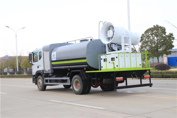 改裝配置:罐體用4MM碳鋼板制作,罐內(nèi)隔板具有防波作用,以減低灑水車行駛時罐體液體的沖擊。整車帶一個專用灑水泵(垂直最大吸程6米),灑水寬度14米,射程28米。多功能灑水車配備2個前沖(噴)(能將路面泥巴、塵土、垃圾沖干凈);2個后灑(能均勻地將水灑在路面,一次灑水寬度14米)、2個側(cè)噴(花灑)(能均勻地將路旁綠化帶澆灌)、帶1個后工作平臺,平臺上安裝1個綠化灑水高炮(灑水炮可全方位旋轉(zhuǎn),可連續(xù)調(diào)成直沖狀、大雨、小雨、毛毛雨,霧狀可調(diào)節(jié)沖洗高大樹木),引水時間<5min,流量90m3/h。帶1個消防接頭,帶1個自流閥,1個過濾裝置、人性化爬梯及側(cè)防護欄,安裝灑水音樂喇叭。