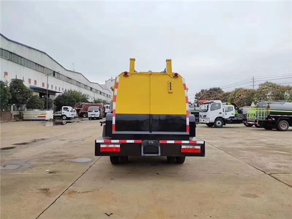 ① 將后門操作手柄推至開啟位置,箱體左右兩側墻板油缸伸出,使箱體后門先水平推出一段距離后,向上翻起打開;松開操作手柄回中位;
