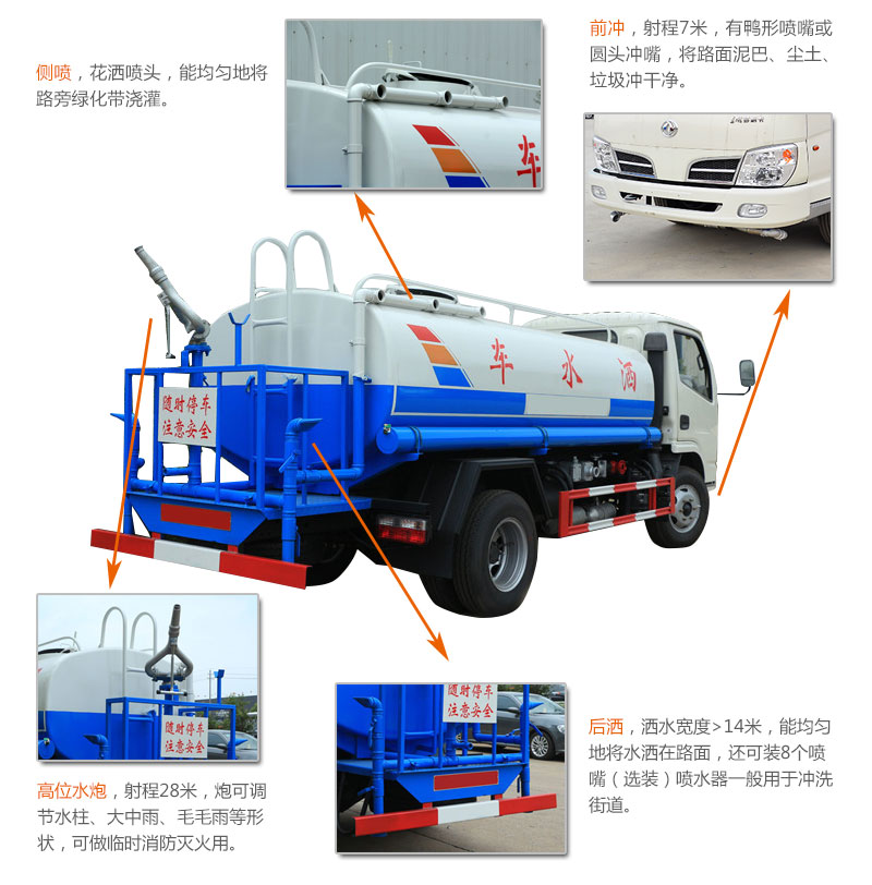 1. 噴藥灑水車:加裝噴藥裝置,噴藥射程15-80米可選,裝水容積4-20方可選。 2.吸糞灑水車:集吸糞和灑水于一體,配汽油本田灑水泵+大功率真空吸污泵。 3.載貨灑水車:水罐裝在載貨車箱內(nèi),配灑水泵,也可裝水龍頭用于工地和礦區(qū)儲(chǔ)水。 4.保溫灑水車:罐體外面加8厘米厚保溫層,適合北方使用,也可運(yùn)送熱水。 5.雪鏟灑水車:車前配可拆卸式雪鏟,冬天用于鏟雪開路,方便可靠。 6.帶吊灑水車:裝有隨車吊,可配2-10噸吊機(jī),用于綠化種植吊樹澆灌。 7.消防灑水車:配消防泵消防炮,射程達(dá)45米,配消防帶接口,作消防用。 8.越野灑水車:采用4驅(qū)6驅(qū)底盤,越野輪胎,適合礦區(qū)煤井等場合作業(yè)。