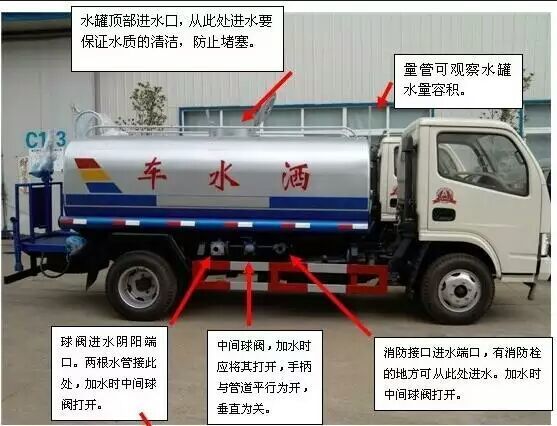 灑水車前裝有鴨形噴嘴或圓頭沖嘴,后面裝有圓柱開灑水噴嘴或蓮蓬頭噴嘴,后部有一工作平臺,裝配有水炮。后部還可裝8個噴嘴(選裝)噴水器一般用于沖洗街道,起除塵和降溫作用,其噴水器可以用調節(jié)噴嘴螺紋的方法改變噴水器的噴灑方向和角度,高射水炮可以用于城鄉(xiāng)園林綠化及應急消防。蓮蓬嘴可以澆落路中間噴水器沖起的灰塵,起到清潔空氣的作用。