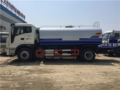 改裝配置:罐體用4MM碳鋼板制作,罐內隔板具有防波作用,以減低汽車行駛時罐體液體的沖擊。整車帶一個專用灑水泵(垂直最大吸程6米),灑水寬度14米,射程28米。多功能灑水車配備2個前沖(噴)(能將路面泥巴、塵土、垃圾沖干凈);2個后灑(能均勻地將水灑在路面,一次灑水寬度14米)、2個側噴(花灑)(能均勻地將路旁綠化帶澆灌)、帶1個后工作平臺,平臺上安裝1個綠化灑水高炮(灑水炮可全方位旋轉,可連續(xù)調成直沖狀、大雨、小雨、毛毛雨,霧狀可調節(jié)沖洗高大樹木),引水時間<5min,流量90m3/h。帶1個消防接頭,帶1個自流閥,1個過濾裝置、人性化爬梯及側防護欄,安裝灑水音樂喇叭。