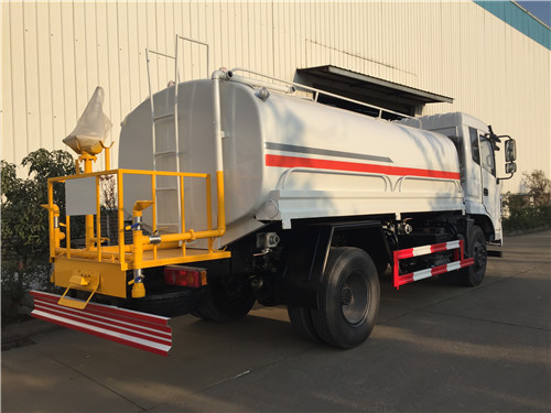 灑水車前裝有鴨形噴嘴或圓頭沖嘴,后面裝有圓柱開(kāi)灑水噴嘴或蓮蓬頭噴嘴,后部有一工作平臺(tái),裝配有水炮。后部還可裝8個(gè)噴嘴(選裝)噴水器一般用于沖洗街道,起除塵和降溫作用,其噴水器可以用調(diào)節(jié)噴嘴螺紋的方法改變噴水器的噴灑方向和角度,高射水炮可以用于城鄉(xiāng)園林綠化及應(yīng)急消防。蓮蓬嘴可以澆落路中間噴水器沖起的灰塵,起到清潔空氣的作用。