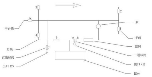 工作水路示意:水經過罐體出口、三通球閥 G、過濾網、泵、前沖后灑和花撒。(其中 H、I 關閉)。