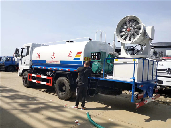 東風(fēng)12噸抑塵車選配50米噴霧機(jī)達(dá)到除塵效果。霧炮機(jī)是根據(jù)風(fēng)送原理,先使用進(jìn)口高壓泵、微細(xì)霧化噴嘴將水霧化,再利用風(fēng)機(jī)風(fēng)量和風(fēng)壓將霧化后的水霧送到較遠(yuǎn)距離,使得水霧到達(dá)較遠(yuǎn)距離同時能夠覆蓋更大面積,水霧與粉塵凝結(jié)后降落,從而達(dá)到降塵目的。