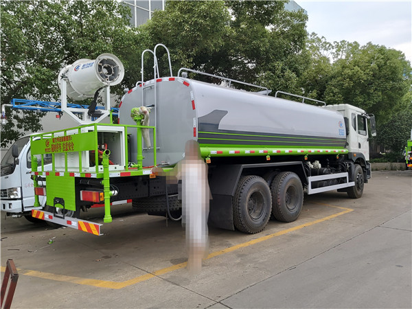 灑水車前裝有鴨形噴嘴或圓頭沖嘴,后面裝有圓柱開灑水噴嘴或蓮蓬頭噴嘴,后部有一工作平臺(tái),裝配有水炮。后部還可裝8個(gè)噴嘴(選裝)噴水器一般用于沖洗街道,起除塵和降溫作用,其噴水器可以用調(diào)節(jié)噴嘴螺紋的方法改變噴水器的噴灑方向和角度,高射水炮可以用于城鄉(xiāng)園林綠化及應(yīng)急消防。蓮蓬嘴可以澆落路中間噴水器沖起的灰塵,起到清潔空氣的作用。
