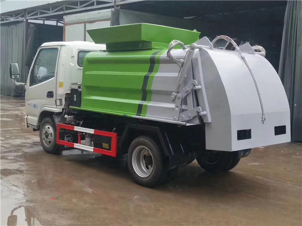 裝料裝置:自動提升裝料裝置設在廂體的前部右側面,由支架、鏈條機構、掛鉤等組成。使用此裝置可將垃圾桶內(nèi)的垃圾自動提升裝入廂體內(nèi)。