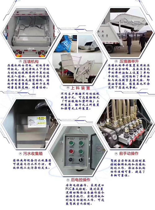 壓縮垃圾車(chē)(以下簡(jiǎn)稱垃圾車(chē))是適用于城鎮(zhèn)袋裝、桶裝、散裝生活垃圾的收集、運(yùn)輸、裝卸作業(yè)的專用車(chē)輛。垃圾被壓縮機(jī)構(gòu)壓入車(chē)箱,從而使垃圾高密度均勻地分布在車(chē)箱內(nèi),直至裝滿為止,壓縮垃圾車(chē)的收運(yùn)方式是目前世界上廣泛采用的垃圾收運(yùn)方式,其專用裝置的功能均以汽車(chē)發(fā)動(dòng)機(jī)為動(dòng)力,通過(guò)液壓機(jī)構(gòu)來(lái)實(shí)現(xiàn)。車(chē)輛的箱體、填壓器及污水箱均采用優(yōu)質(zhì)低合金鋼板全密封焊接結(jié)構(gòu),具有強(qiáng)度高,重量輕,不產(chǎn)生二次污染等優(yōu)點(diǎn)。