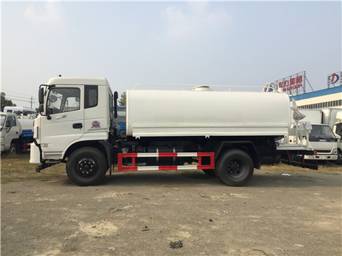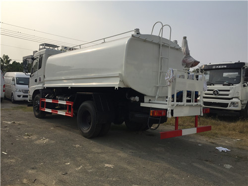 灑水車前裝有鴨嘴型噴霧或圓頭沖嘴,后面裝有圓柱形灑水砣,側(cè)噴花灑蓮花頭,車后部裝有高射噴槍。(選裝)