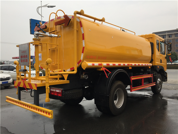 灑水車上裝配置:罐體有效容積12立方,采用5毫米厚武鋼碳板板自動焊接制作,配品牌大功率灑水泵,帶前噴后灑側噴,尾部平臺帶高位水炮,可自吸自排。前沖14米寬,水炮射程28米,自吸深度7米。
