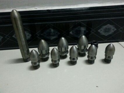 除了直噴頭以外,每個噴頭都有向后的6個噴射孔(一邊穿透、破碎、攪拌堵塞物,一邊推動噴頭和耐高壓水管前進),其中2、3、5、8號另外,還有一個前噴孔(穿刺堵塞物并作為導(dǎo)引孔)。