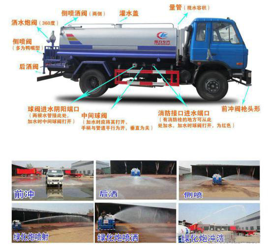 前沖(一般安裝在駕駛室前,也有安裝在駕駛室和罐體之間),后灑、側(cè)噴,后工作平臺(tái)并配有綠化灑水炮。綠化灑水炮一般可以調(diào)節(jié)成霧狀、柱狀、毛毛雨、中雨、大雨等。