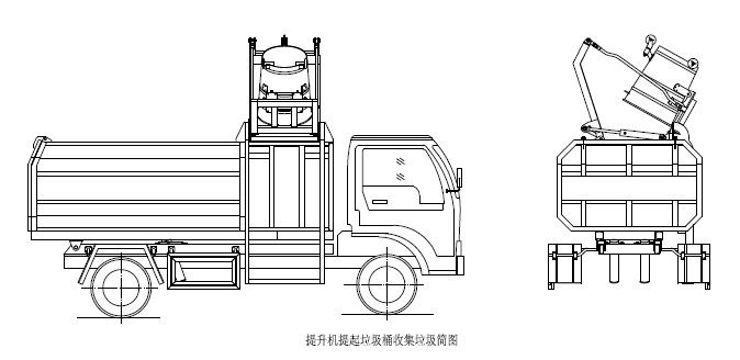步驟1.首先將垃圾桶放置在提升機(jī)的掛鉤處,再將提升或上蓋(選裝)操作手柄推至升起位置,箱體右側(cè)提升機(jī)油缸或頂端上蓋開蓋油缸伸出,使提升機(jī)帶動(dòng)垃圾桶向上升起并旋轉(zhuǎn)翻倒垃圾,垃圾進(jìn)入箱體。松開操作手柄使其回到中位;如圖: