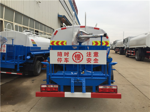 灑水車的基本配置:罐體用4MM碳鋼板制作,罐內(nèi)隔板具有防波作用,以減低灑水車行駛時罐體液體的沖擊。整車帶一個專用灑水泵(垂直最大吸程6米),灑水寬度14米,射程28米。灑水車配備2個前沖(噴)(能將路面泥巴、塵土、垃圾沖干凈);2個后灑(能均勻地將水灑在路面,一次灑水寬度14米)、2個側(cè)噴(花灑)(能均勻地將路旁綠化帶澆灌)、帶1個后工作平臺,平臺上安裝1個綠化灑水高炮(灑水炮可全方位旋轉(zhuǎn),可連續(xù)調(diào)成直沖狀、大雨、小雨、毛毛雨,霧狀可調(diào)節(jié)沖洗高大樹木),引水時間<5min,流量90m3/h。帶1個消防接頭,帶1個自流閥,1個過濾裝置、人性化爬梯及側(cè)防護(hù)欄,安裝灑水音樂喇叭。